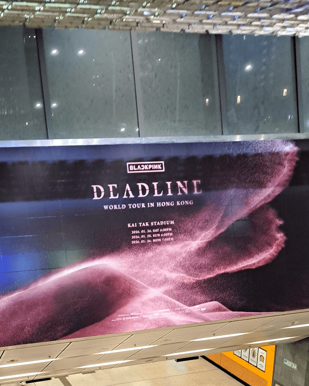韓國女團BLACKPINK四位成員Jisoo、Jennie、Rosé及Lisa再次合體,舉行第三次世界巡迴演唱會《DEADLINE》。官方早前宣布將於2026年1月24和25開演唱會,最新宣布加開1月26日一場,BLACKPINK將會一連3日在啟德主場館舉行3場演唱會!