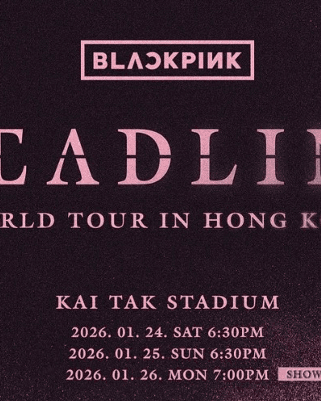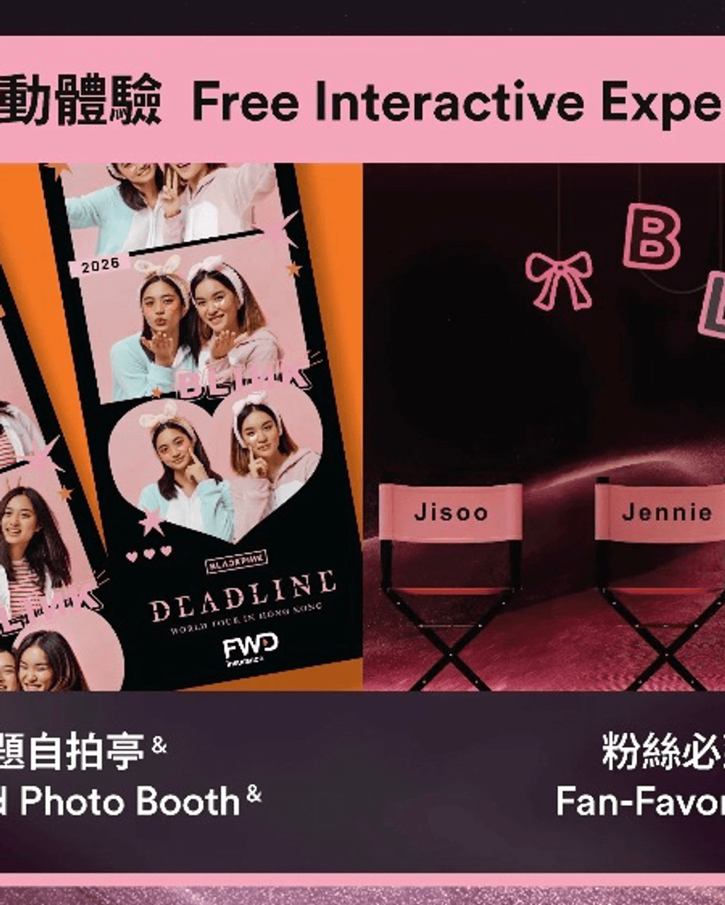 BLACKPINK 世界巡迴演唱會《DEADLINE》將於2026年1月24日至26日在香港啟德主場館舉行!贊助夥伴FWD富衛保險特別於會場內設置獨家活動專區,為樂迷打造一系列專屬打卡場景、互動體驗及限量應援小物,讓每位觀眾在欣賞演唱會之餘,更能沉浸於BLACKPINK的世界。
