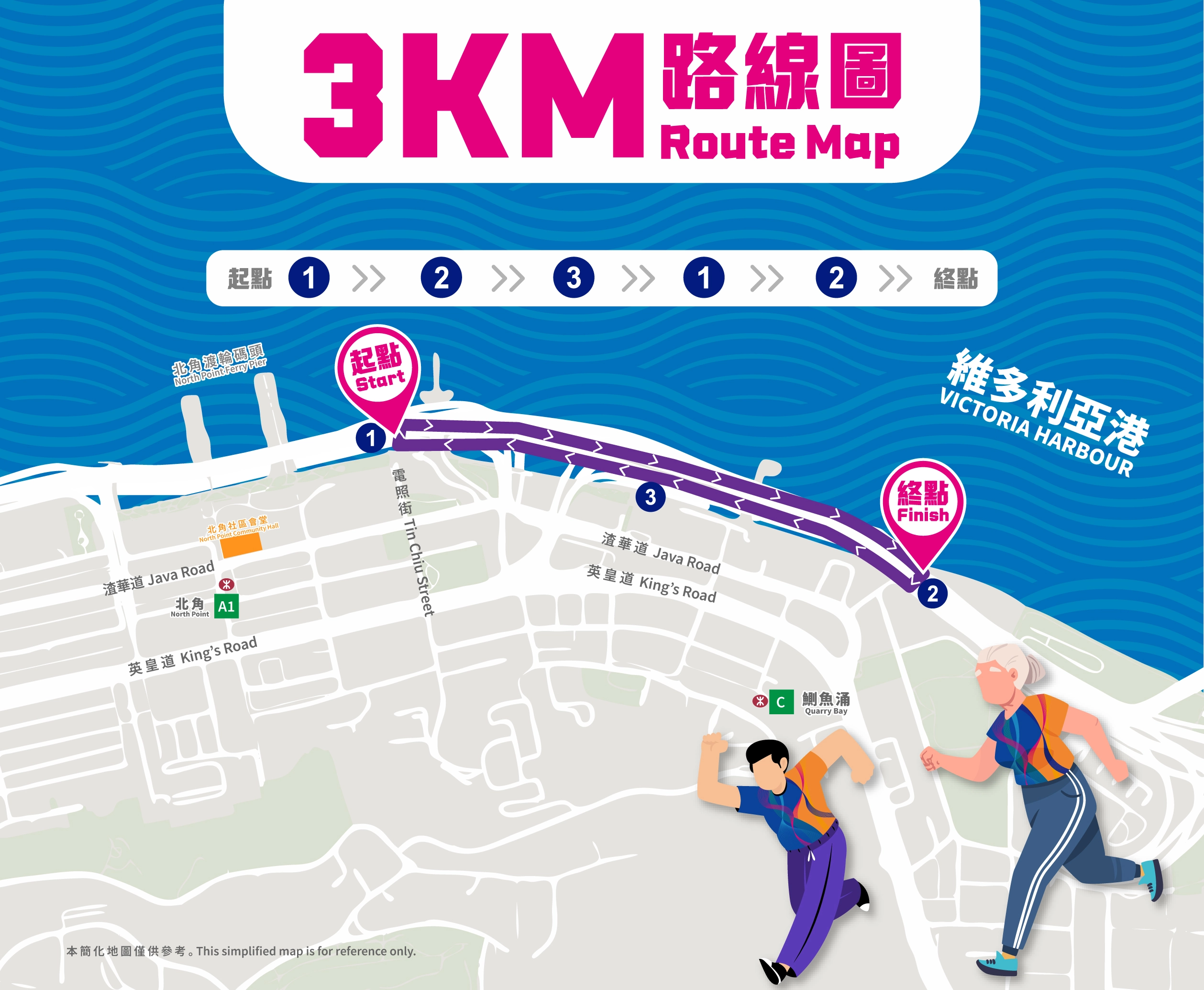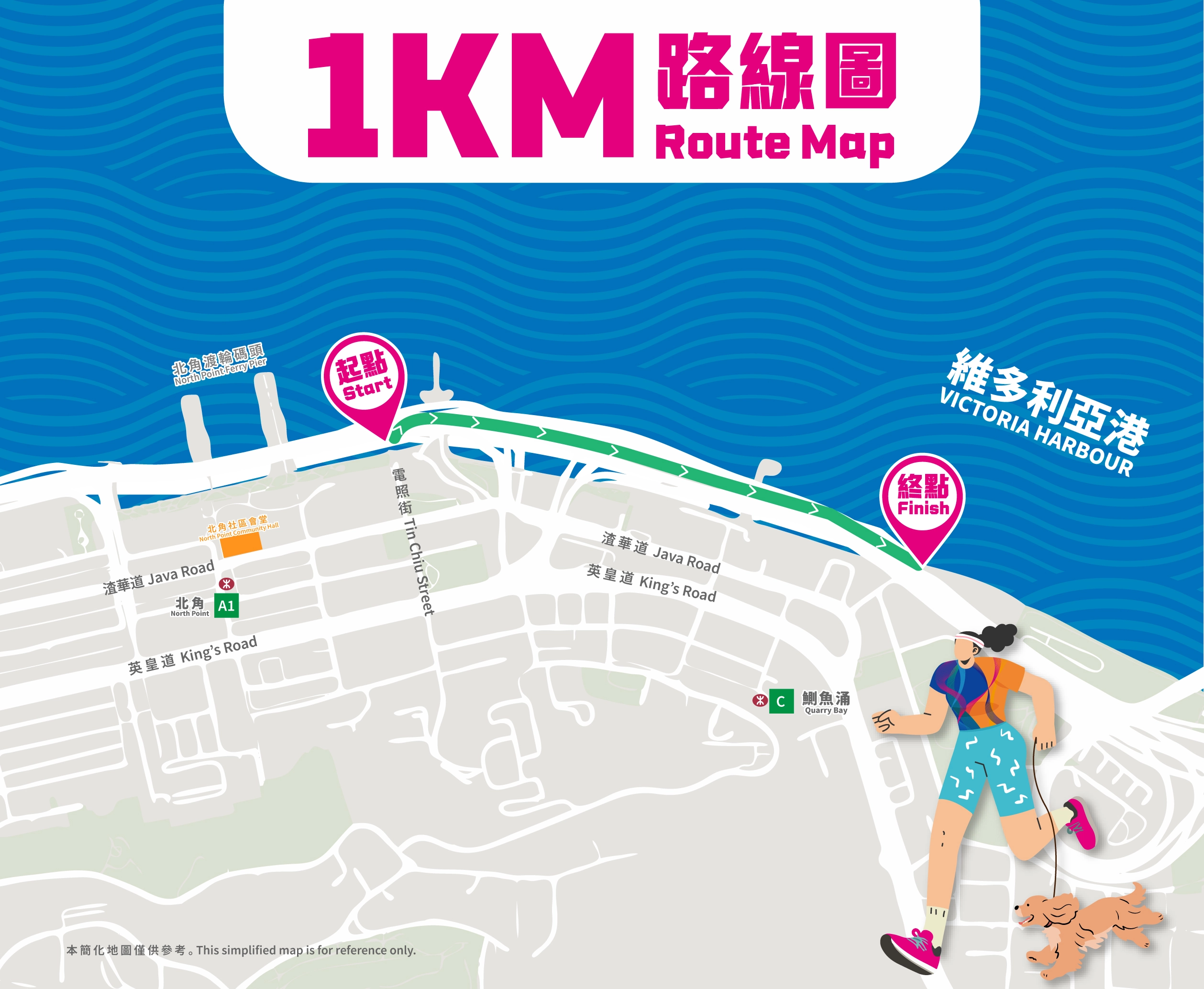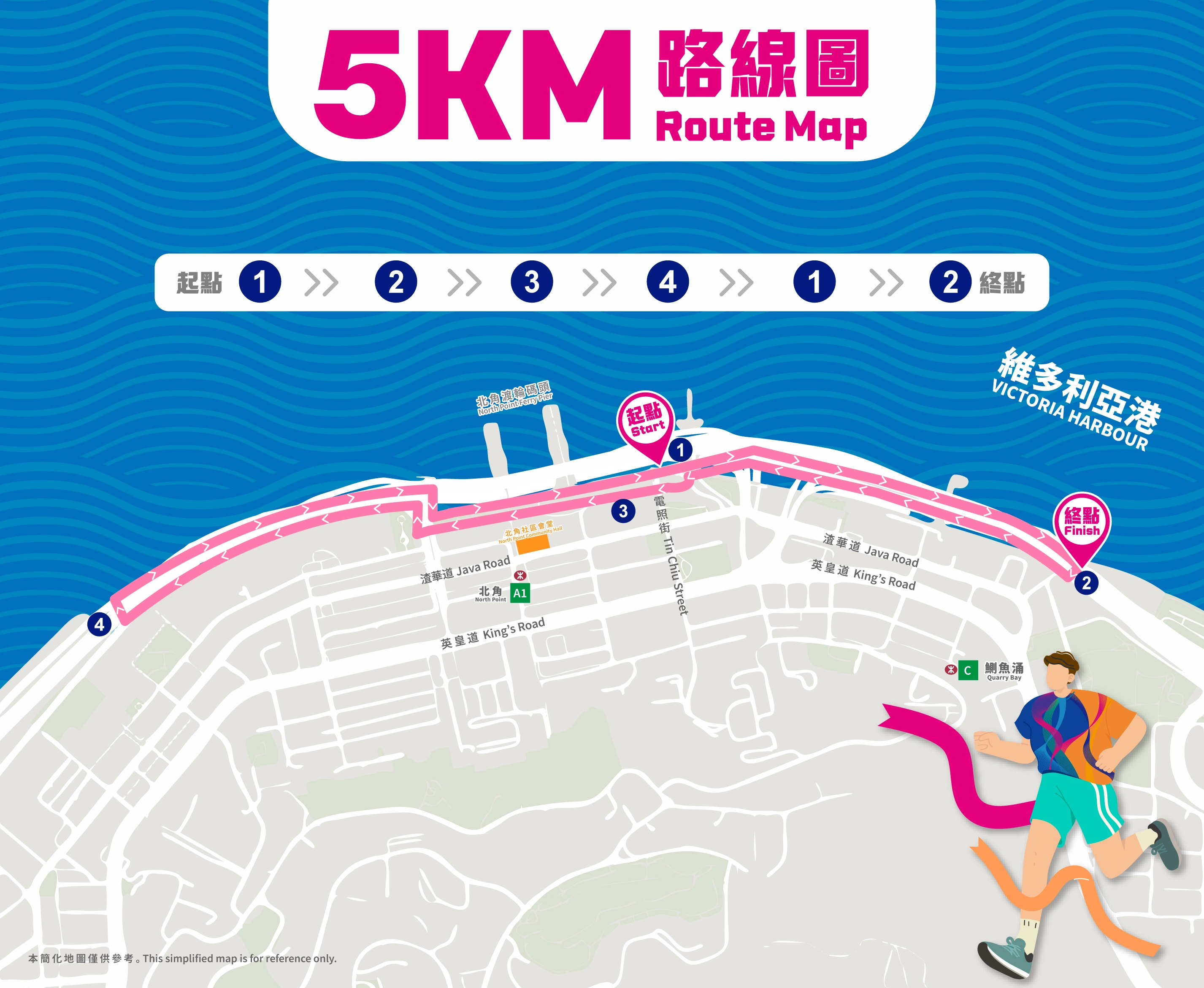 活動由北角東岸板道(東段)近電照街出入口出發,一直延伸至鰂魚涌海裕街附近終點,參加者可沿途欣賞維港景致,同時感受路線上的小食攤位及Busking現場音樂,彷彿置身海濱嘉年華。完成指定路線的參加者可獲頒紀念獎牌,並可於終點區體驗「海濱限定閃卡機」,隨機抽取精美閃卡留念。每位參加者均可獲發選手包,內含號碼布、活動紀念T恤及環保摺疊水杯,方便途中補充水分!