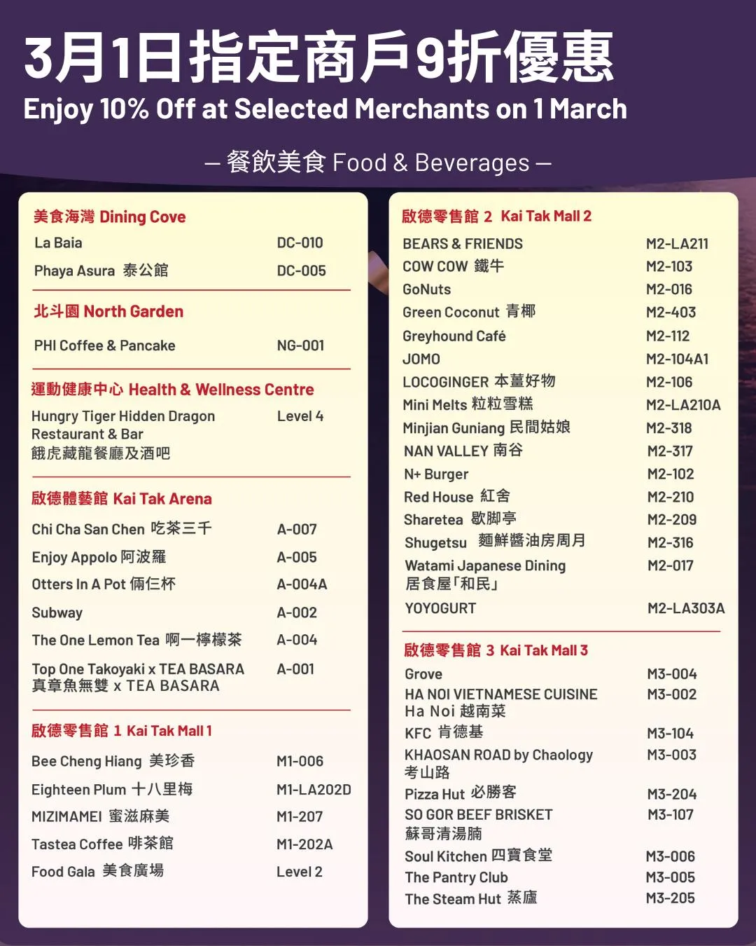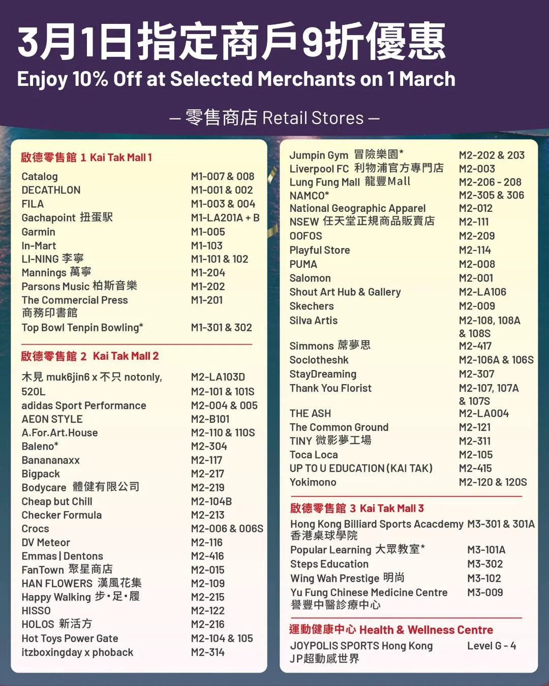 3月1日(星期日)一日限定!啟德體育園超過100間商戶推出「一日限定9折優惠」,涵蓋潮流服飾、美食、生活雜貨到親子樂園,讓你在邊玩邊買邊慶祝的氛圍中,盡情享受購物樂趣。