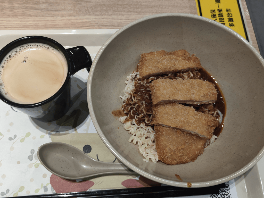 南記撈吉列豬扒混醬公仔麵,份量十足,炸豬扒外脆內嫩,肉香濃郁。混醬鹹甜交織,與麵條緊密融合,口感層次豐富。公仔麵吸收醬汁後更顯滑口,每一口都帶著香脆與濃厚的對比。配上一杯暖飲,既飽肚又滿足,簡單卻令人心情愉快。