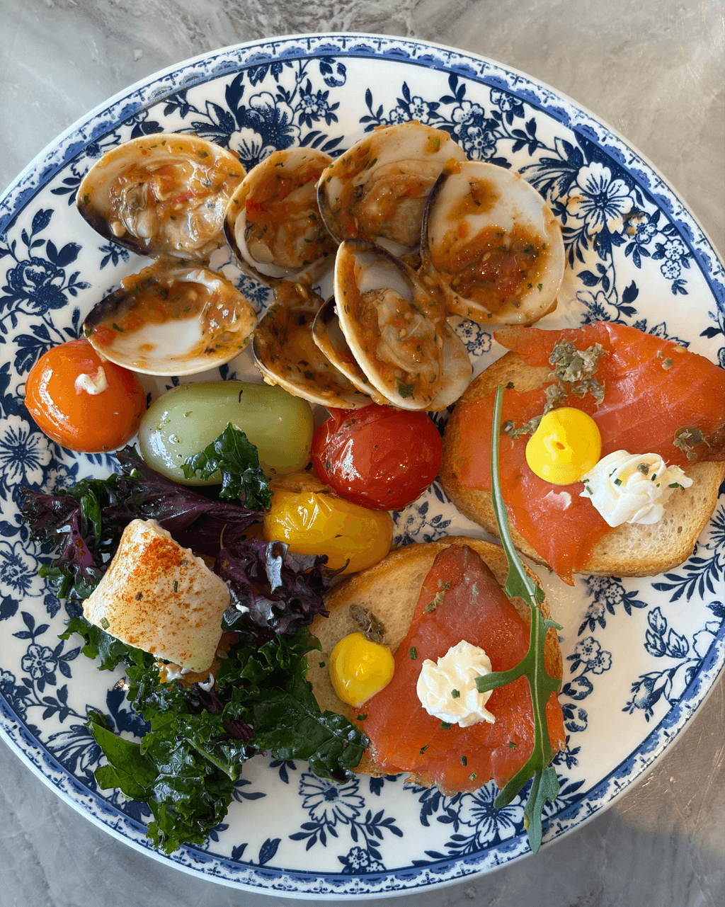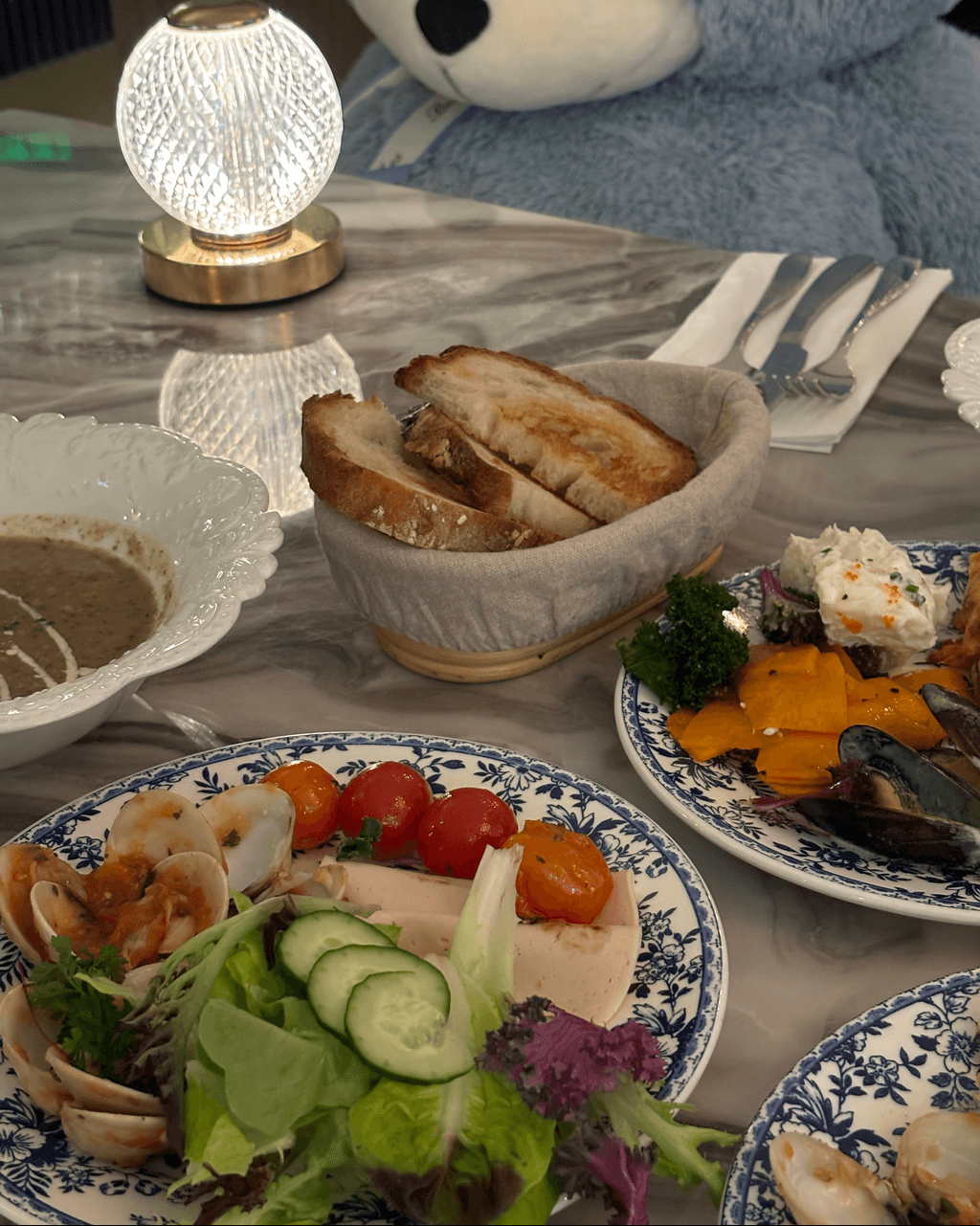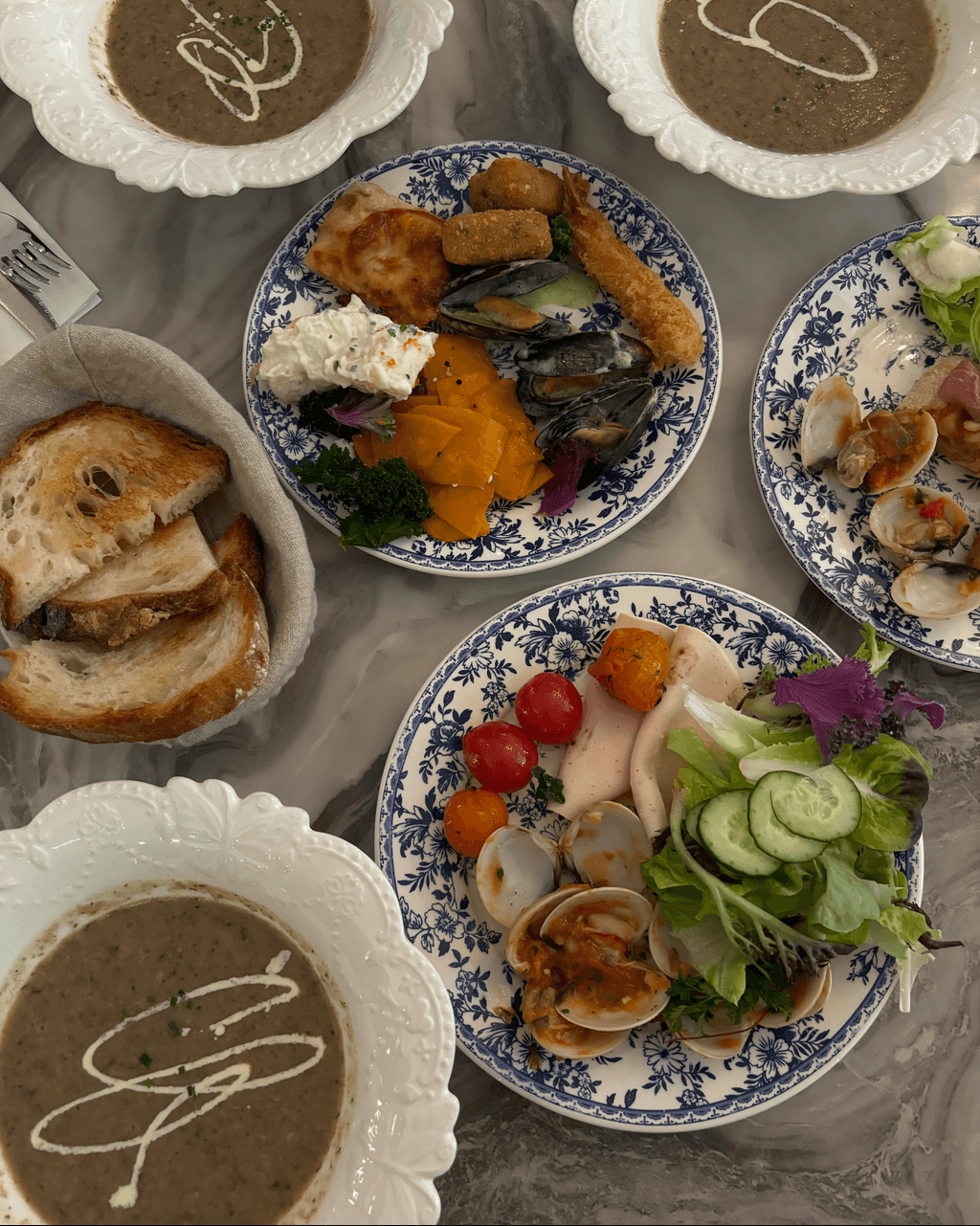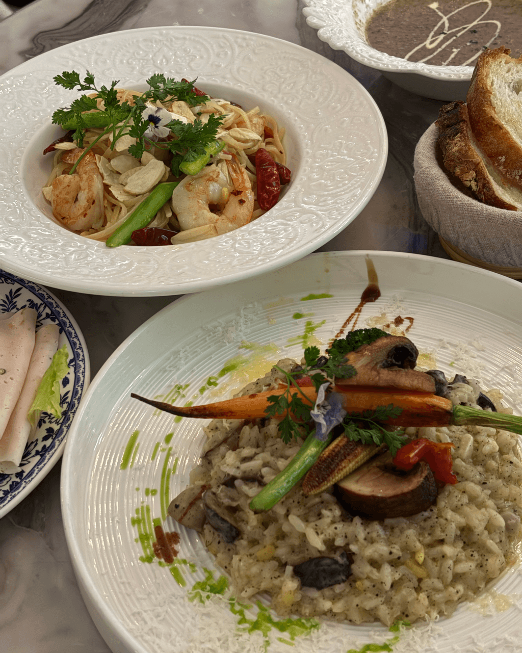 餐廳招牌菜式有牛油花枝墨汁手工意粉、威靈頓羊架、焗蠔 及 烤美國豬眼肉等等,演繹經典與創意的完美平衡。午市有精選套餐,下午茶也是餐廳另一個招牌。 「青花瓷花園雙人茶具」 呈現優雅午后體驗,包括精緻糕點,絕對是和姐妹high tea 打卡必點!。