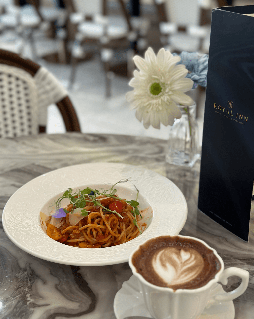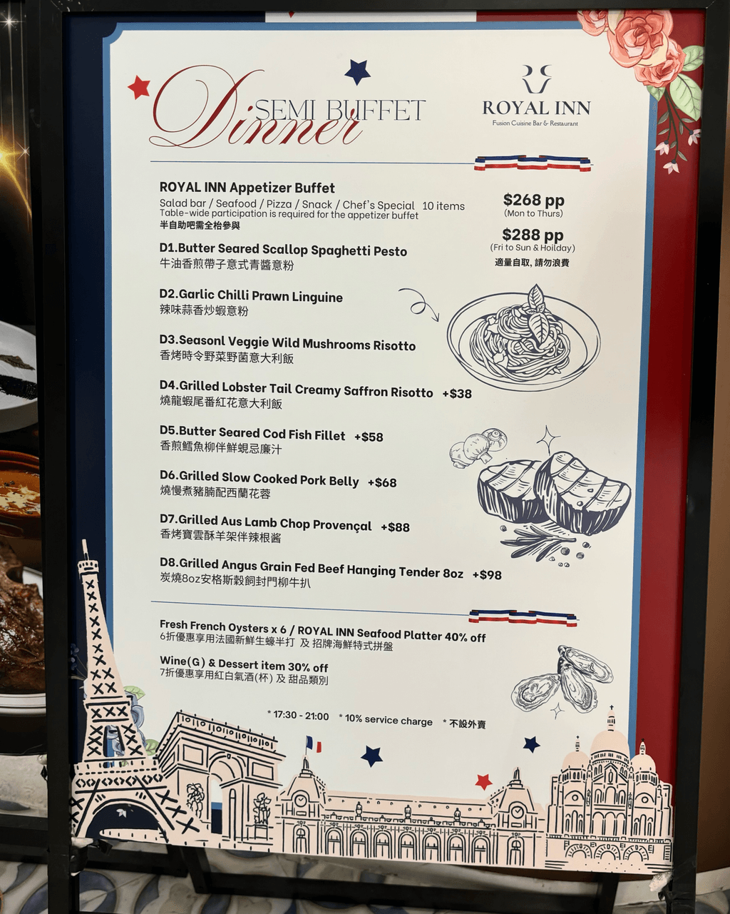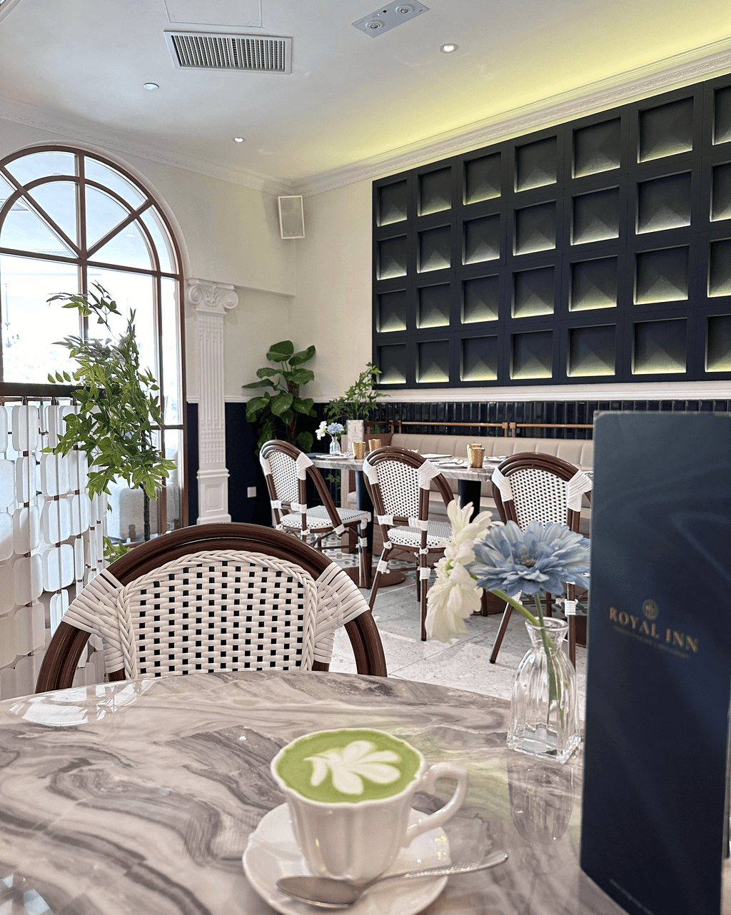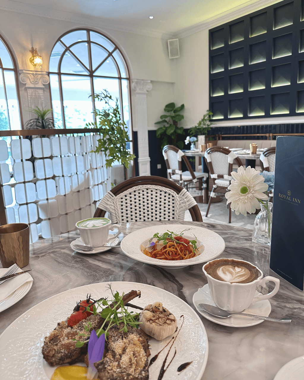 以歐式宮廷為靈感的 Royal Inn,主打現代法式融合菜式,以華麗的羅馬柱與噴泉設計營造浪漫氛圍,展現法式餐飲的典雅格調。