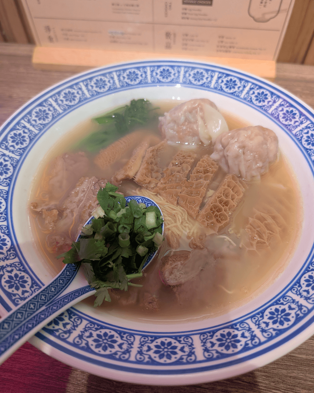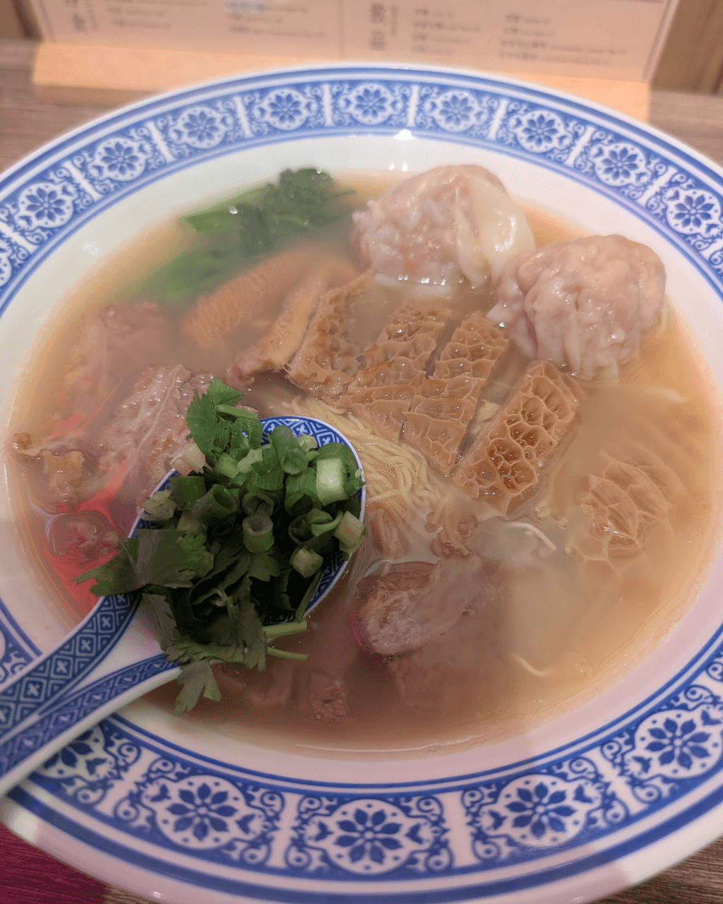 這間店的牛腩採用慢煮方法,讓肉質變得非常軟嫩。湯底每日熬製至少8小時,使用約50公斤的雞殼和雞腳製成雞白湯。另外一款湯底則加入了大地魚。麵條選用超過50年歷史的永樂,河粉則來自超過70年的雙喜,兩間麵店都堅持香港製造。此外,店內的雲吞每粒都大得像拳頭,對於輪椅人士也非常方便,因為入口設有斜路,並不介意減少幾張桌子,展現了十足的誠意和滿滿的愛心!